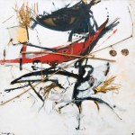 - Dance for Hunting Spirit. 44″x44″, oil and collage on cotton, 1996. Artist’s collection.