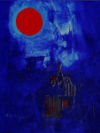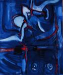 - Red on blue with red peeping through. Acrylic on linen collage, 14″ x 11″, 2014. Private collection.