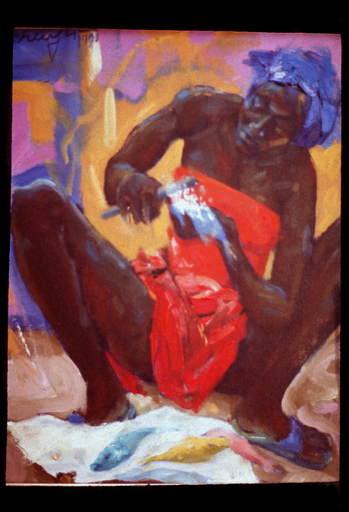 StrippingTheFish_oil-cotton_14x11_1990 Published October 15, 2012 at 491 × 720 in Jamaicans at work ← Previous Next → Stripping the fish. The fish vendor’s whole body seems focused on the act of scaling fish. 14″ x 11″, 1990, Oil on canvas, Private collection. Like Loading...