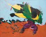 - Risen. Oil on linen, 33″ x 48″, 1995. In the artist’s collection. The doctor bird, symbol of the nation, struggles to remain above danger. The work incorporates further symbolism in the form of a crucible and crown of thorns.