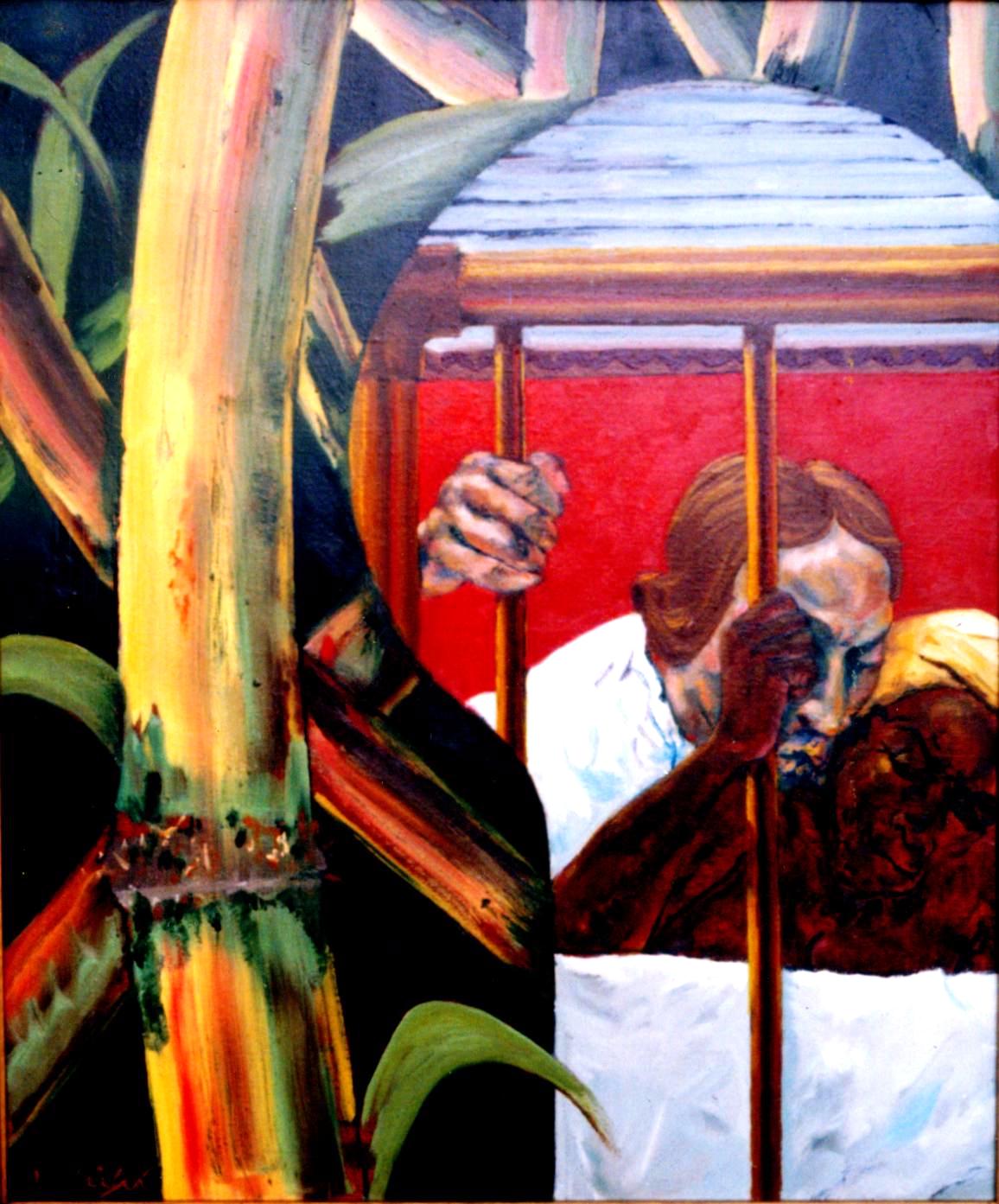 “Ancestral dialogue: evening of browning conception.” Schliefer turns the viewer into a voyeur, peering through a keyhole at some of the painful historical truths. Despite Schliefer’s understated representation of sexual violence, the work was met with disapproval from some quarters. Oil on linen, 28″ x 24″, 2001. Private collection.