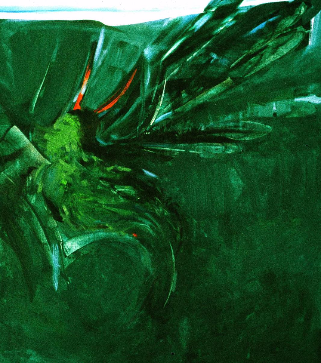 Doctorbird Flight to Hope Horizon. Oil on canvas, 50″x48″, 1992. Private collection. Another example of Schliefer’s use of Jamaica’s national bird to depict the state of the nation. Despite the reference to hope in the title, the feeling conveyed is one of desperate struggle.