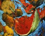 - Sonatina with pumpkin, pawpaw, mango, melon. Inspired by the experience of markets in Jamaica, the idea of the still life throbbing with life and movement is explored in a series of paintings, to begin with the “Sonatina for pumpkin vendor” – also featured on this page. Oil on canvas, 1989. Private collection.
