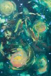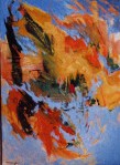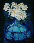 - Still life with flowers and blue jar. Acrylic on cotton, 14″ x 11″, 2018. Private collection.