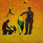 - Posse Tooled for Flag. 39″x52″. Acrylic on linen. Artist’s collection. Exhibited in the Biennial National Exhibition 2008. Like the Kingston Pietà, this work addresses the particular social problem of violence in our society, here depicting the destructive minority. The tools of aggression – everyday utensils such as machetes and gardening implements – give the impression of make-shift rioting and domestically improvised violence. The national flag is viciously attacked, symbolizing the damage to our nationhood.