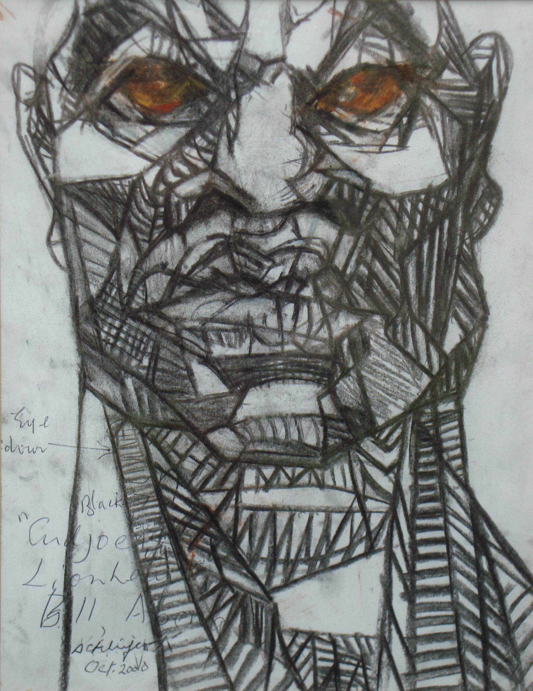 Cudjoe, Lionheart. Pastel and charcoal on paper. 28x22cm. Private collection. Exhibited, alongside White Lady’s Honey with Rising Tide, in the Annual National Exhibition 2000. Eyes ablaze Cudjoe, rebel leader among slaves. The composition, reminiscent of scaffolding, depicts muscular strengths and ruggedness, but also conjures up the image of the Trojan horse which hides an army in its belly.