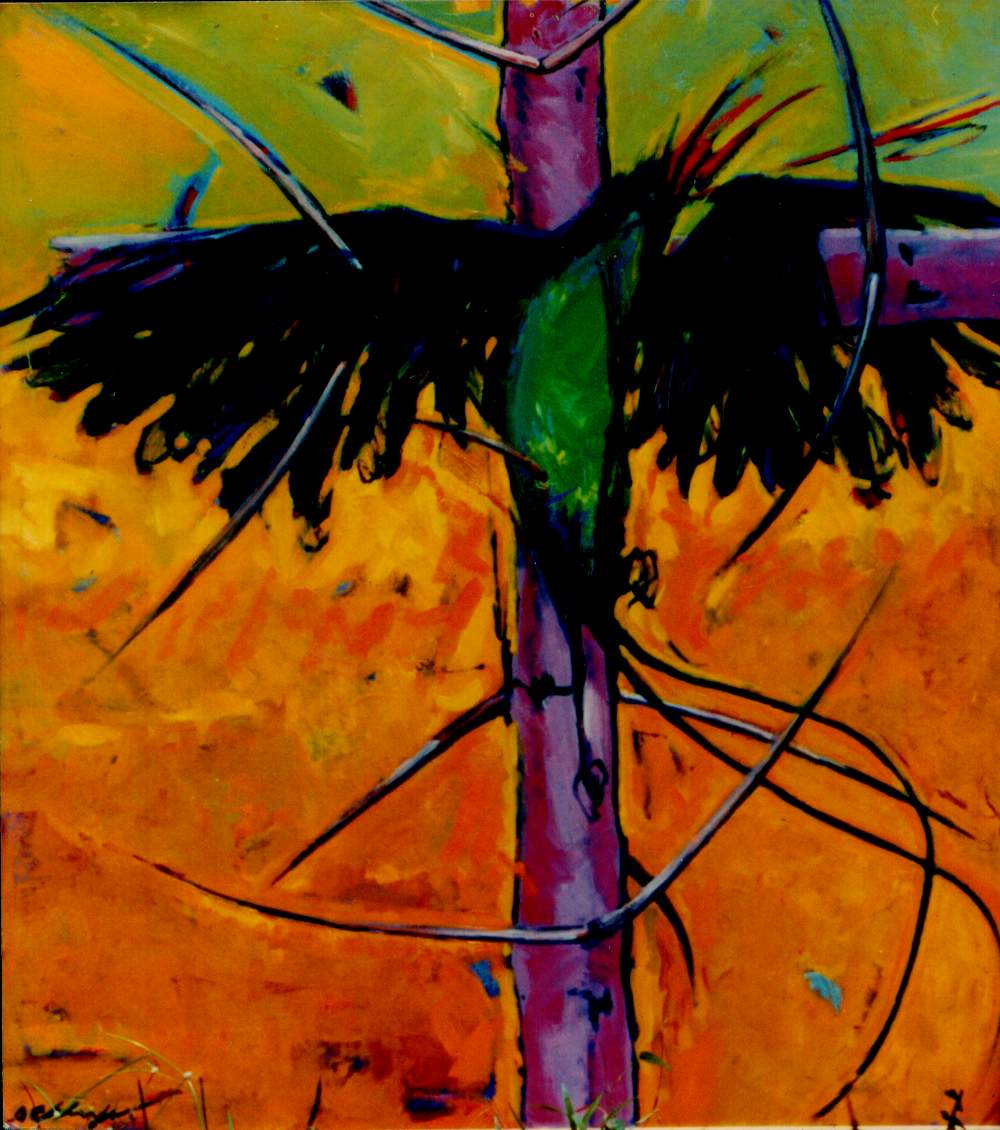 Hummingbird Crucible. Oil on linen, 48″x40″, 1995. Private Collection. The Doctorbird as symbolic representation of Jamaican society is a recurring theme in Schliefer’s work. Here, the Doctorbird is depicted in agony, crucified on a thorny bush reminiscent of the crown of thorns. The companion piece to this painting in the 1995 Annual Exhibition, “Risen”, depicts the Doctorbird precariously hovering above the danger of the thorns.