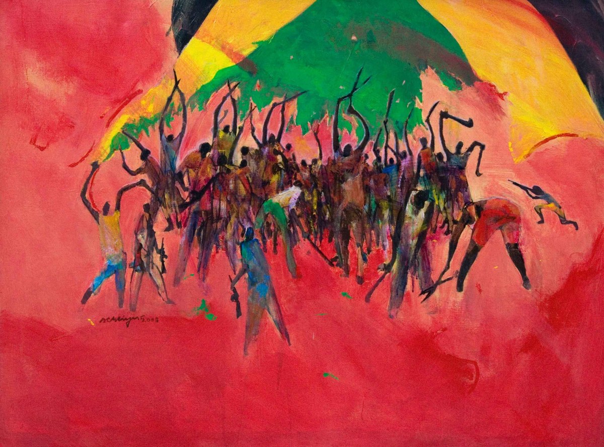 Posse Tooled for Flag. 39″x52″. Acrylic on linen. Artist’s collection. Exhibited in the Biennial National Exhibition 2008. Like the Kingston Pietà, this work addresses the particular social problem of violence in our society, here depicting the destructive minority. The tools of aggression – everyday utensils such as machetes and gardening implements – give the impression of make-shift rioting and domestically improvised violence. The national flag is viciously attacked, symbolizing the damage to our nationhood.
