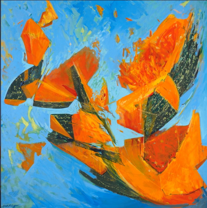 Sonatina from Pumpkin Vendor. 54″x54″. Oil on cotton. Collection the National Gallery of Jamaica. Exhibited in the Annual National Exhibition 1989. Schliefer’s signature painting – in his own words: “the sonatina, the pumpkin, the vendor … combined to make the poetic personal vision, derived from the Jamaican market scene, come together in abstracted phantasy.”